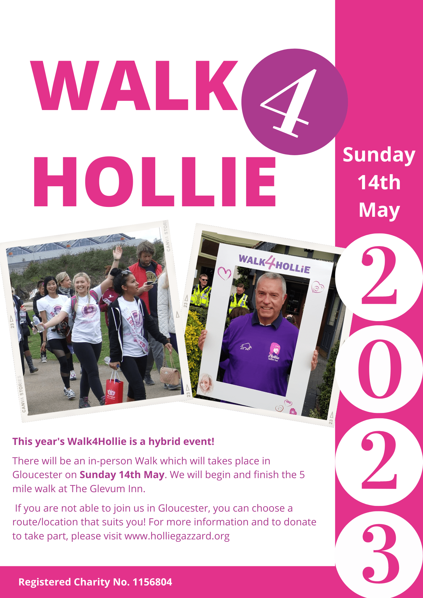 This year’s Walk4Hollie is a hybrid event. There will be an in-person Walk which will take place in Gloucester on Sunday 14th May. We will begin and finish the walk at The Glevum Inn pub, Longlevens.